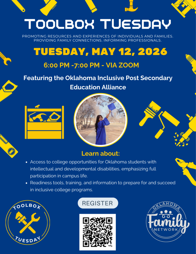 12may6:00 pm7:00 pmMay 12th Toolbox Tuesday-Featuring Oklahoma Inclusive Post Secondary Education Alliance, Julie Lackey
